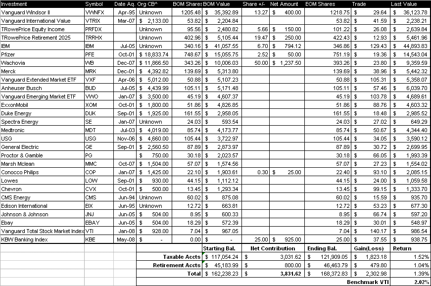 - We bought more into the financial industry with additional investments in Wachovia and an initial investment in the KBW Banking Index ETF.