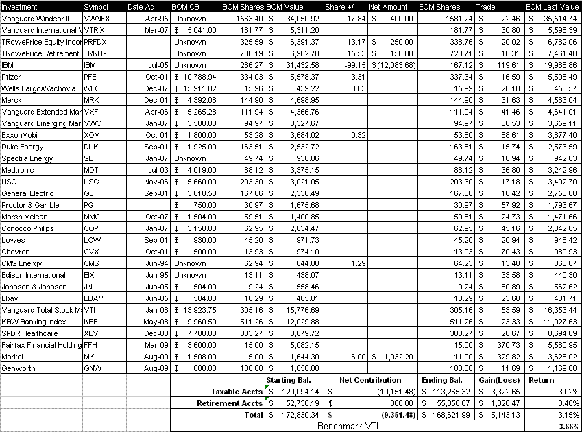 - Our major transaction was to sell another 100 shares of IBM. We have been overweight in my employer's stock through its ESPP plan. For the past couple of years we have been slowly reducing our holdings in IBM. For now the proceeds will sit in cash until I see an opportunity to invest it.
